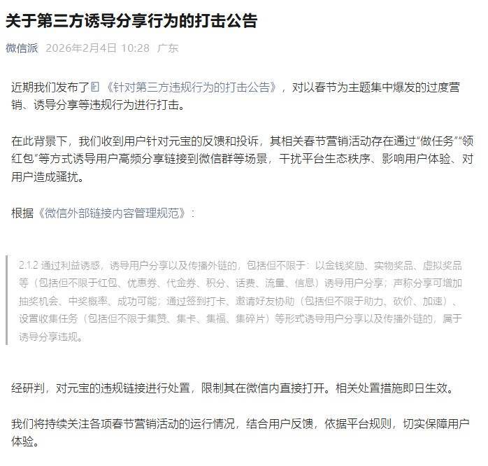 很快,微信安全中心与 “微信派” 相继发文给出解释:近期收到大量用户投诉,元宝的春节营销活动通过 “做任务”“领红包” 等方式,诱导用户高频向微信群分享链接,不仅干扰了平台生态秩序,更对用户造成了实质性骚扰。依据《微信外部链接内容管理规范2.1.2条,这种 “以利益诱惑诱导分享” 的行为本就属于违规范畴,无论是现金红包、虚拟奖品,还是签到打卡、邀请好友助力等形式,都在禁止之列。最终,微信决定对元宝的违规链接采取限制措施,禁止在微信内直接打开,且处置当日生效。