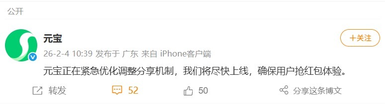 面对微信的处置,元宝官方很快做出回应,称 “正在紧急优化调整分享机制,将尽快上线以确保用户抢红包体验”。